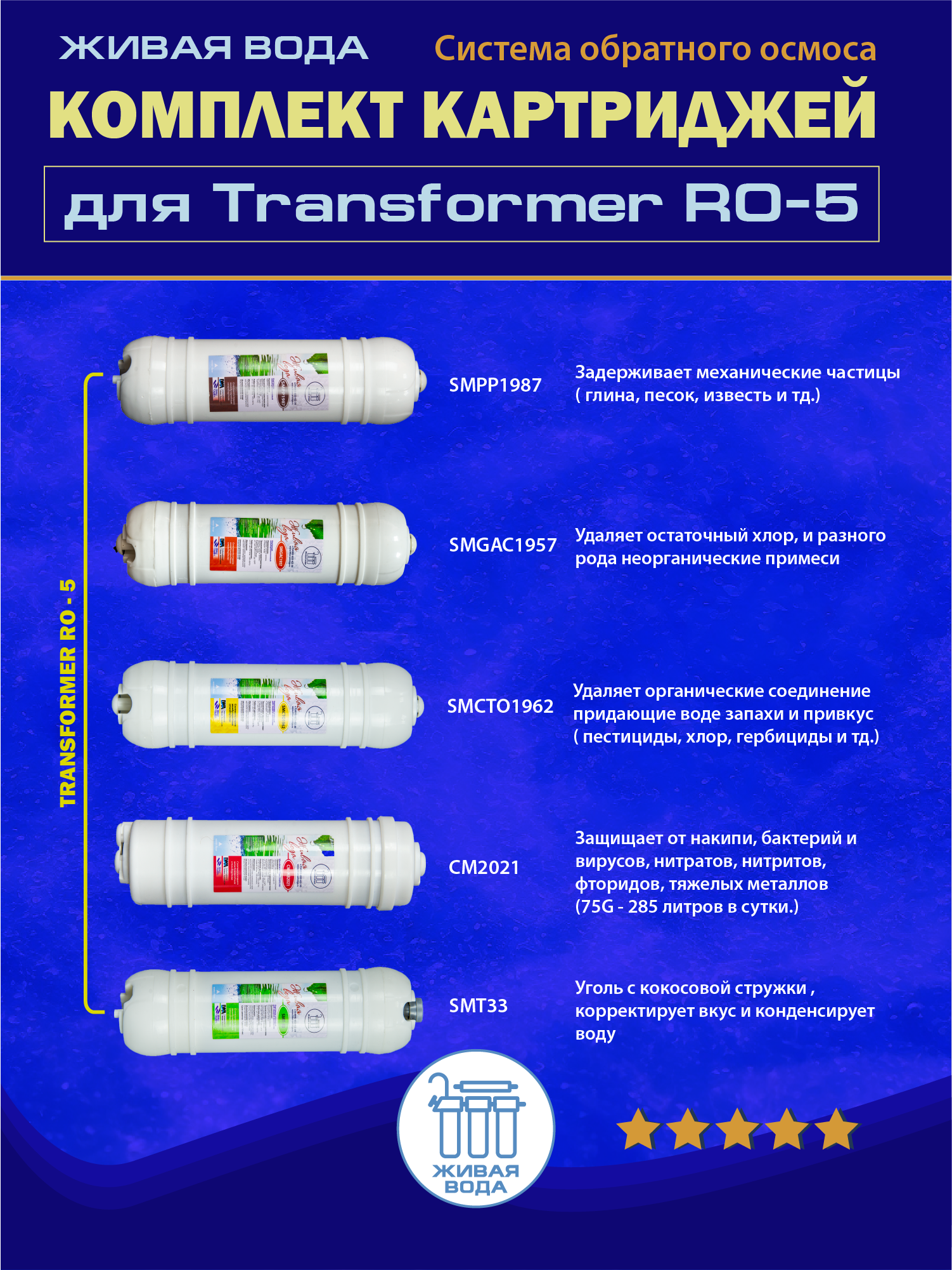 Данный комплект подходит для фильтров Живая вода Трансформер RO5, а также Новая вода, Sendo.
