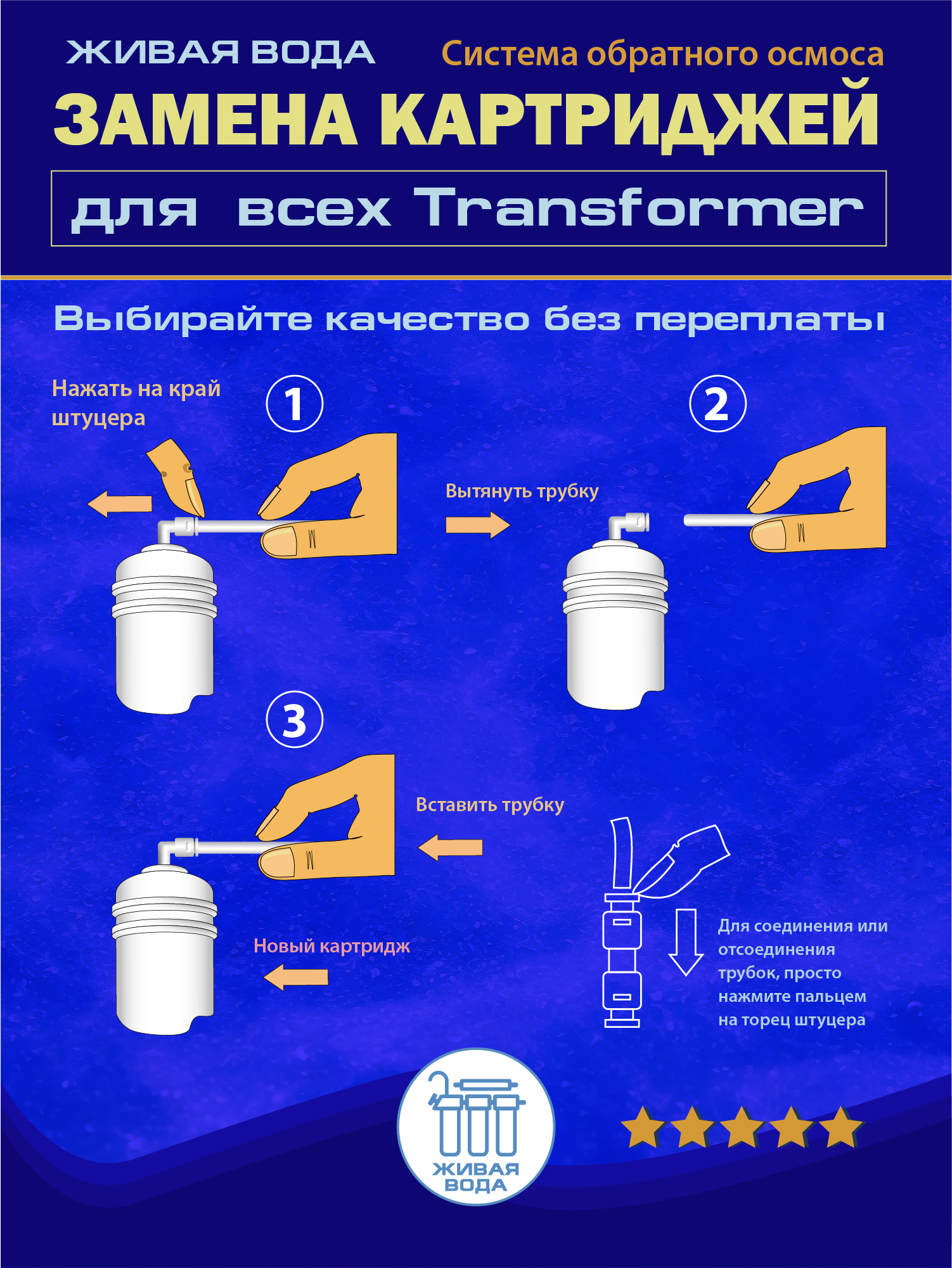 Пропуск воды через обратноосмотическую мембрану. Вода проходит основную очистку. Мембрана препятствует поступлению практически всех органических соединений. Кроме того, обеспечивает надежную защиту от посторонних жидкостей, вирусов, бактерий, ртути, железа, мышьяка, марганца и т.д.