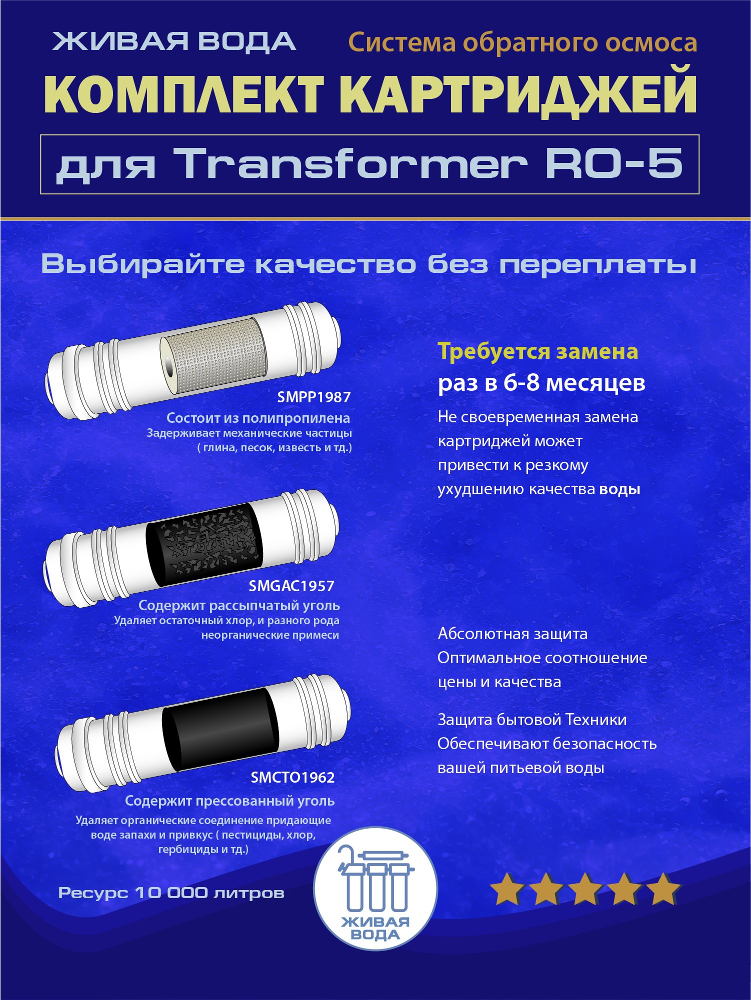 Данный комплект подходит для фильтров Живая вода Трансформер RO5, а также Новая вода, Sendo.