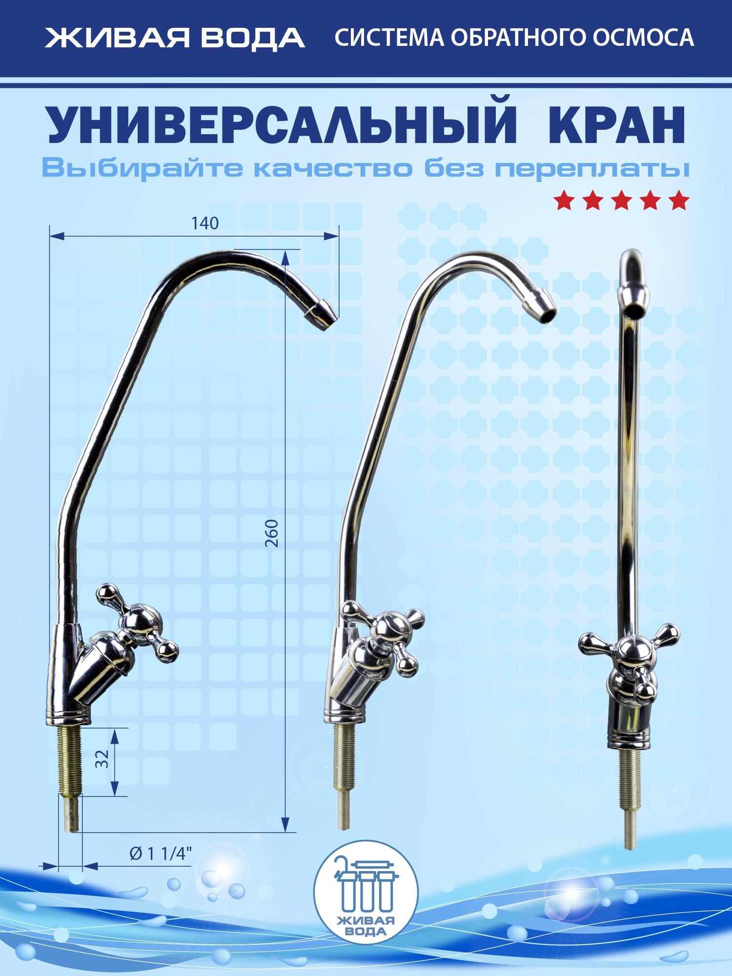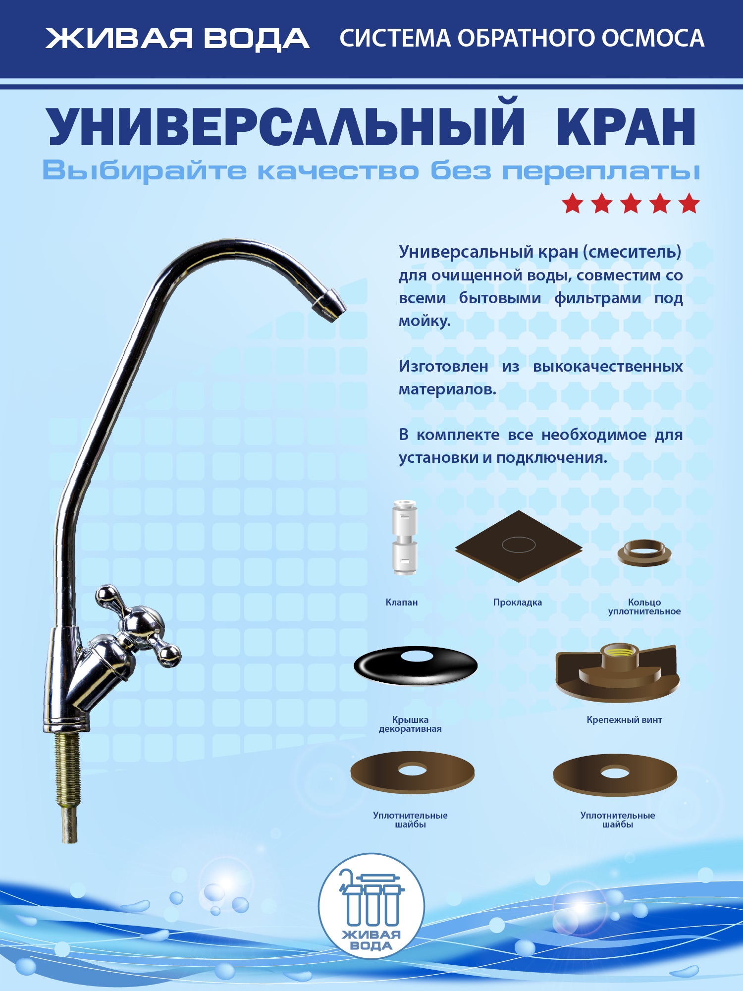 Хромированный кран для выхода питьевой воды. Устанавливается на мойку/столешницу. Дизайн крана может отличаться от указанного на изображении. Совместим с фильтрами обратного осмоса Живая Вода Трансформер.