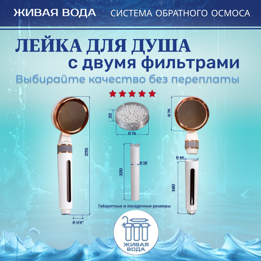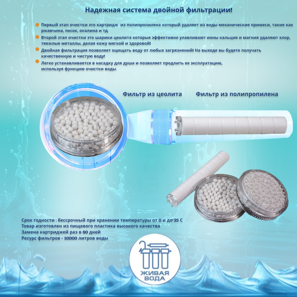 Лейка для душа с двойным фильтром Живая Вода представляет собой инновационное решение для обеспечения чистоты и здоровья вашей кожи и волос во время душа. Этот товар пользуется огромной популярностью благодаря своей функциональности и удобству использования. Основным преимуществом данной лейки для душа является двойная система фильтрации, которая обеспечивает максимальную очистку воды от различных примесей и загрязнителей. Первый уровень фильтрации – картридж из полипропилена, который эффективно удаляет механические примеси, такие как ржавчина, песок и окалина. Второй этап очистки осуществляется с помощью шариков цеолита, которые улавливают ионы кальция и магния, удаляют хлор и тяжелые металлы, делая воду мягкой и безопасной для кожи.Изготовленная из прочного АБС-пластика, внутренняя часть лейки выполнена из нержавеющей стали, что обеспечивает ее долгий срок службы и надежность в использовании. Конструкция лейки не подвержена коррозии, а удобная и эргономичная ручка предотвращает скольжение при использовании. Данная модель лейки для душа обладает круглой формой и глянцевой поверхностью, что добавляет современный стиль вашей ванной комнате. Установка лейки производится на стену, стандарт подводки 3/4″. Ощутите разницу с Лейкой для душа Живая Вода с двойным фильтром и наслаждайтесь чистотой, мягкостью и свежестью воды каждый раз, когда принимаете душ.